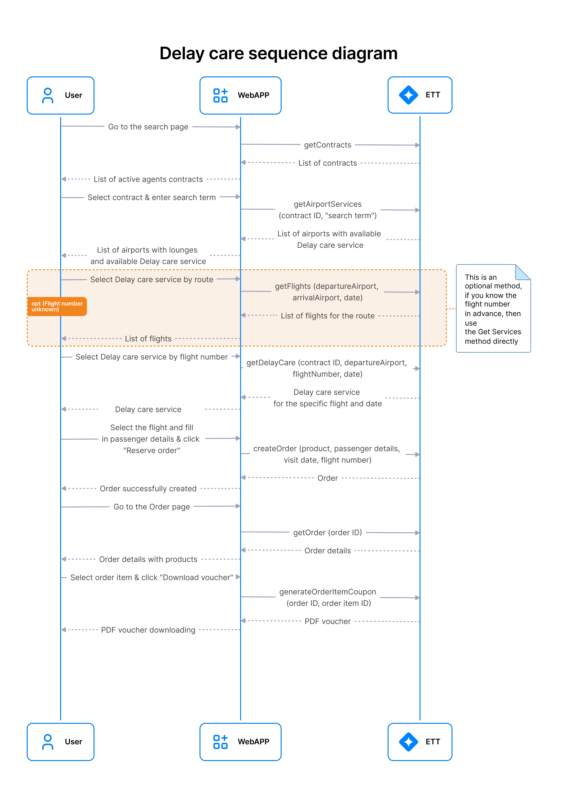 This scenario describes the interaction flow between the client and the ETT API via the WebApp for searching, selecting, and booking Delay Care services, as well as retrieving a voucher.