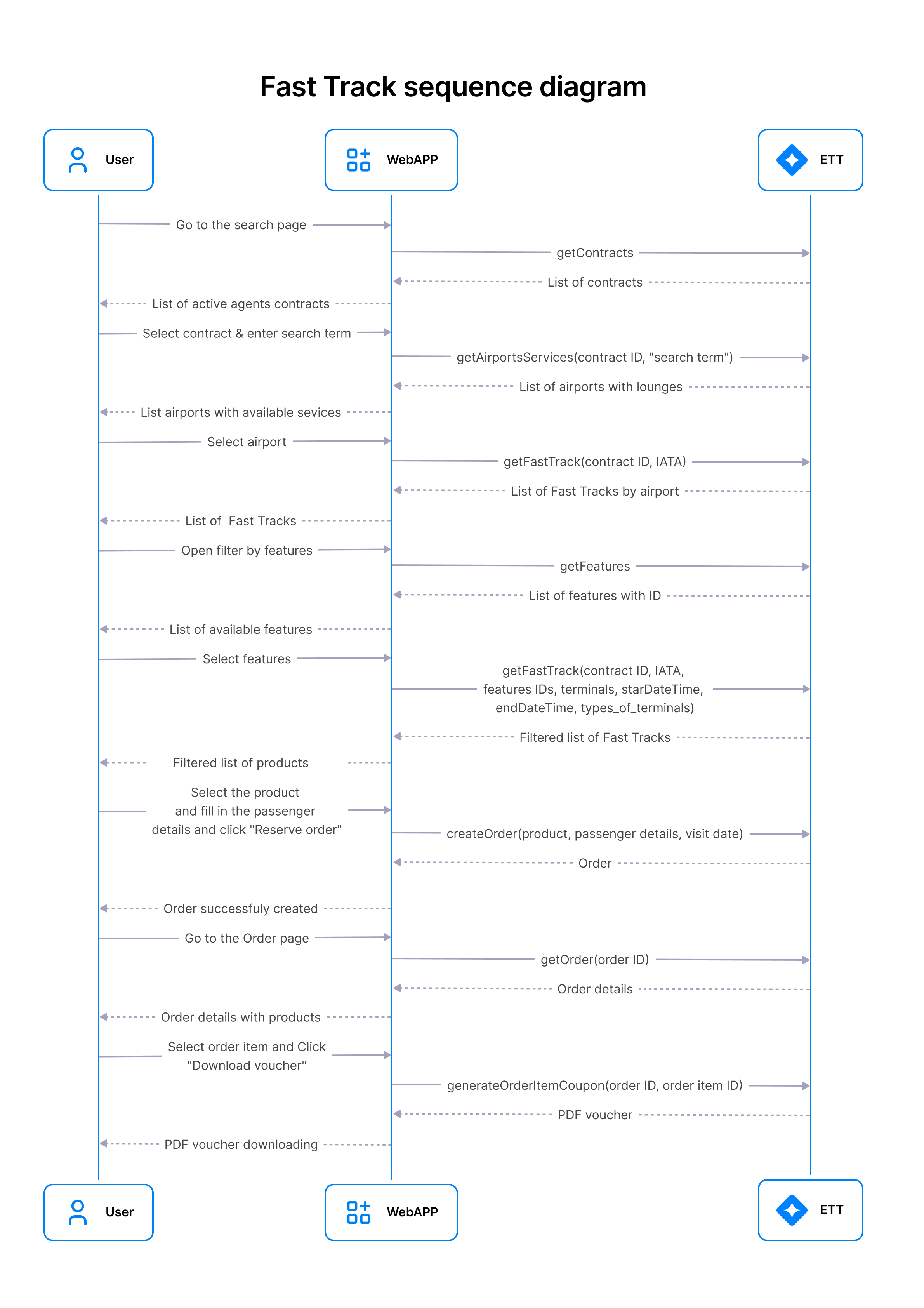 This scenario describes the interaction flow between the client and the ETT API via the WebApp for searching, filtering, booking Fast Track services, and retrieving a voucher.