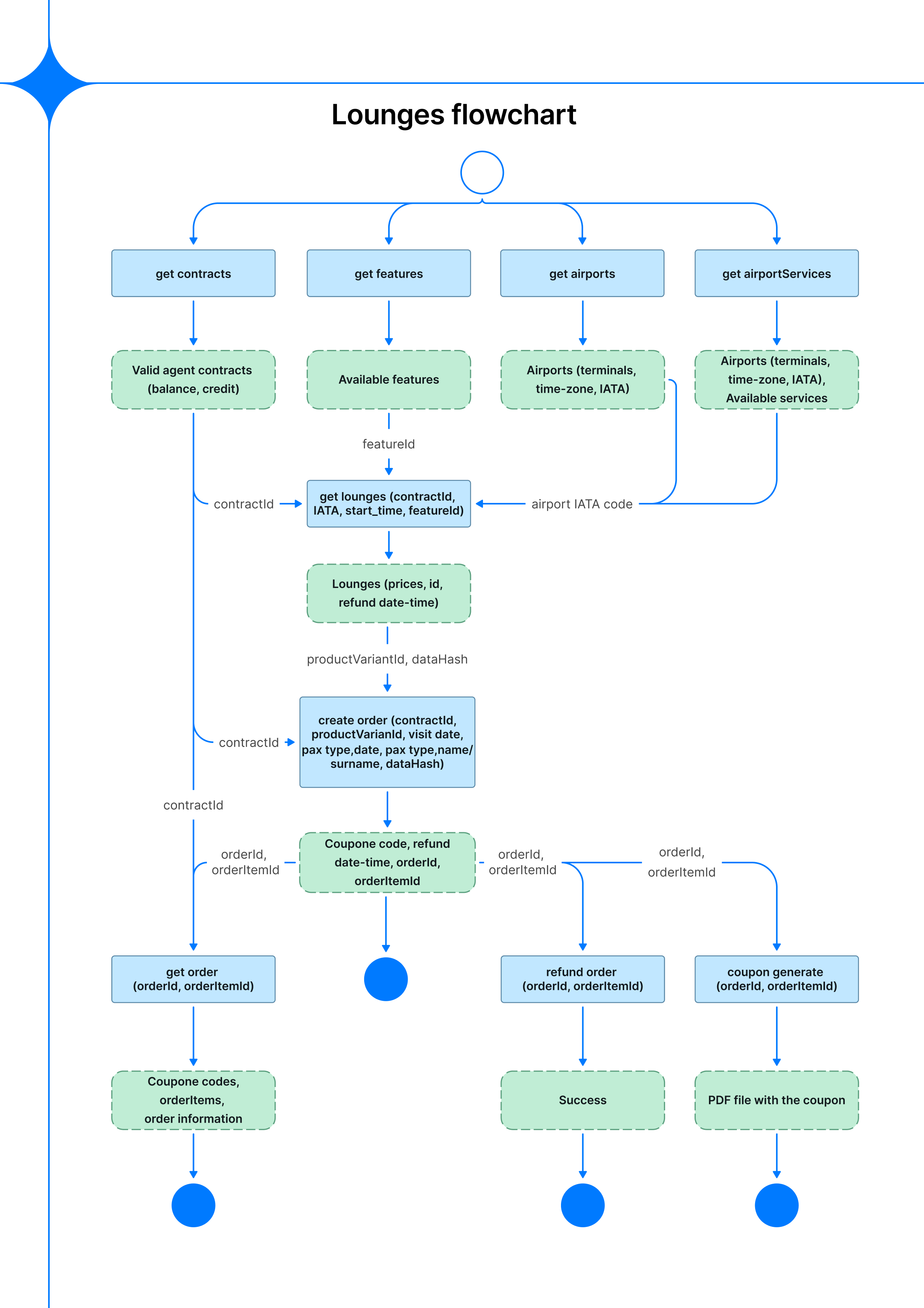 Lets your users search for and book airport lounge access across a global network of terminals. The flow starts with fetching active contracts and available airport services, then narrows down to specific lounges by IATA code, features, and time window. Once a product is selected, an order is created and a PDF voucher is issued for the passenger.