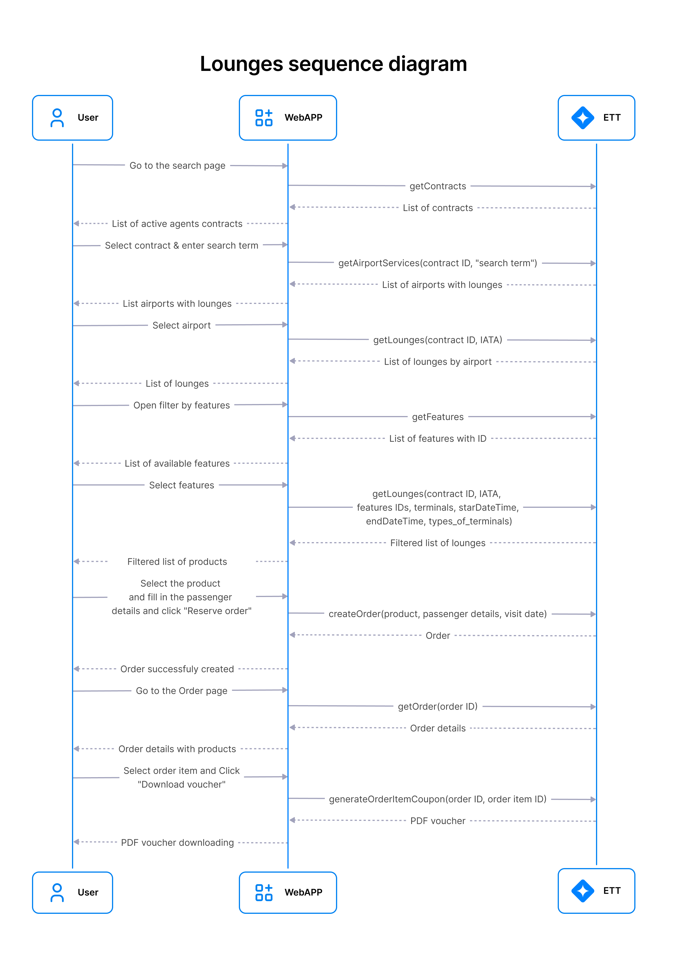 This scenario describes the interaction flow between the client and the ETT API via the WebApp for searching, filtering, booking lounges, and retrieving a voucher.